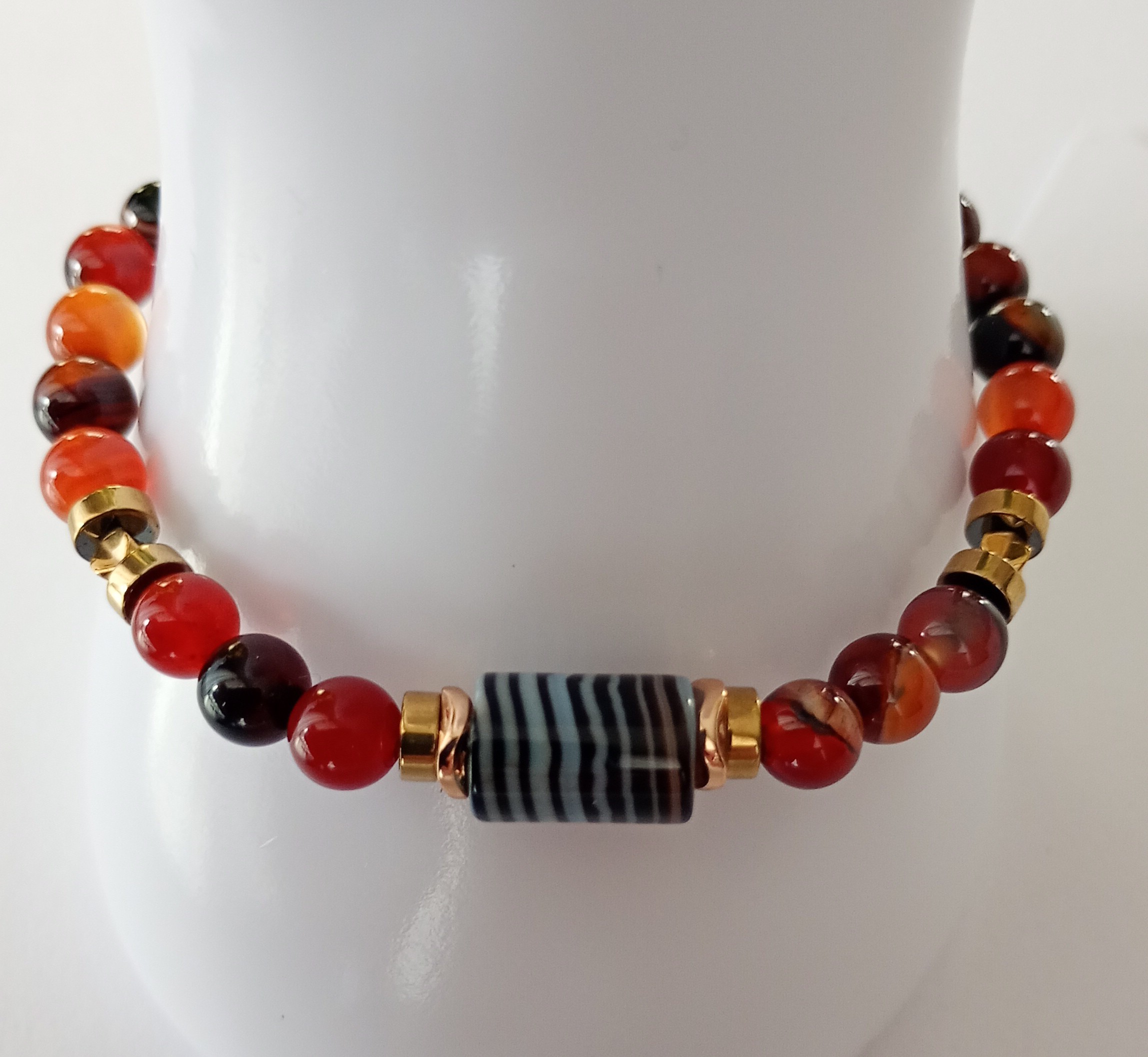 Agat pomarańczowo- brązowy w prążki, hematyt. Kamienie o wielkości 6 mm, 12/8 mm. Wykonana na gumce jubilerskiej, na  obwód nadgarstka – 17 cm.