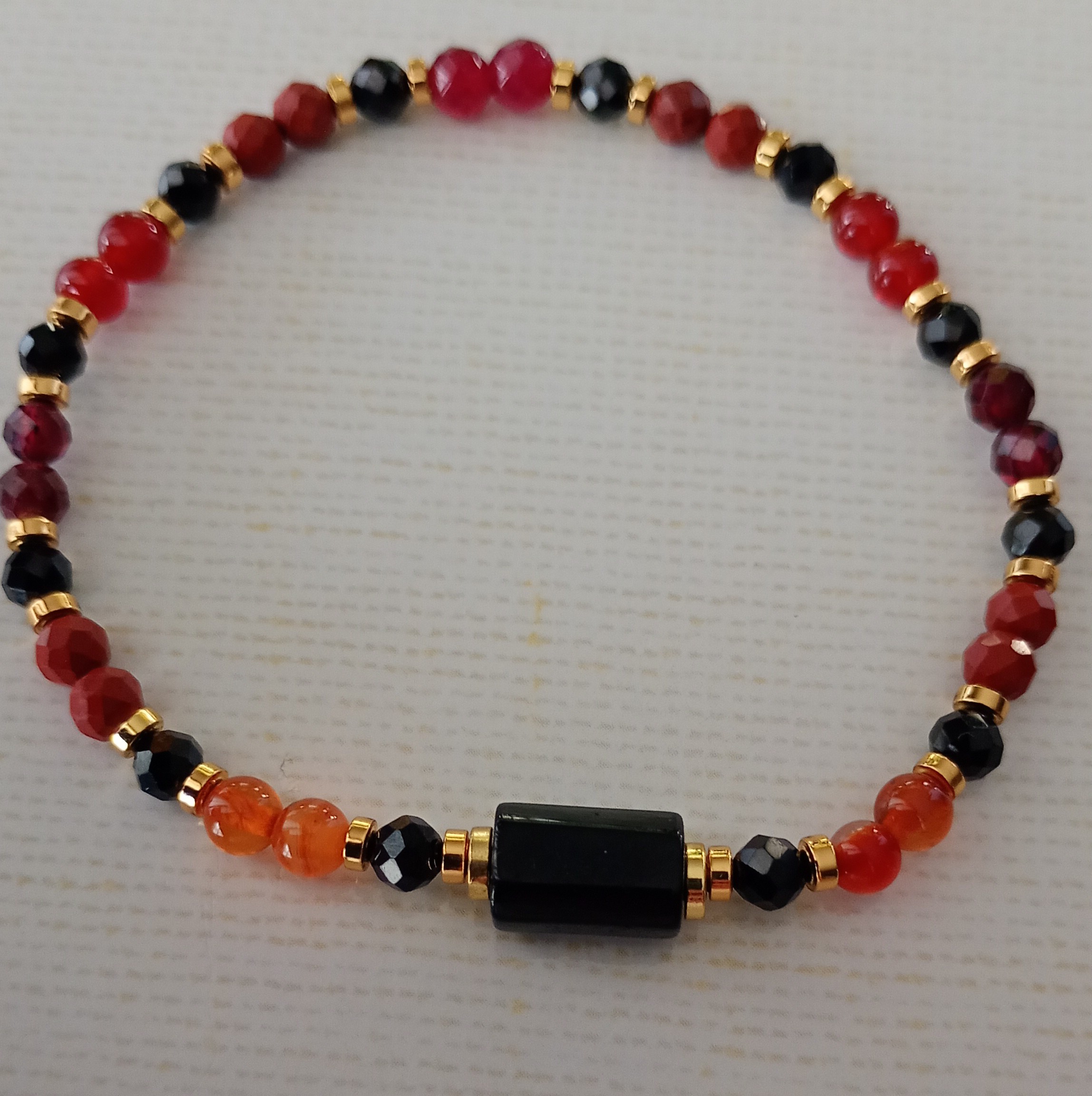 Agat karneol, jaspis  czerwony, granat, rubin, turmalin, hematyt. Kamienie o wielkości 4 mm, 11/8 mm. Wykonana na gumce jubilerskiej, na  obwód nadgarstka – 17 cm.