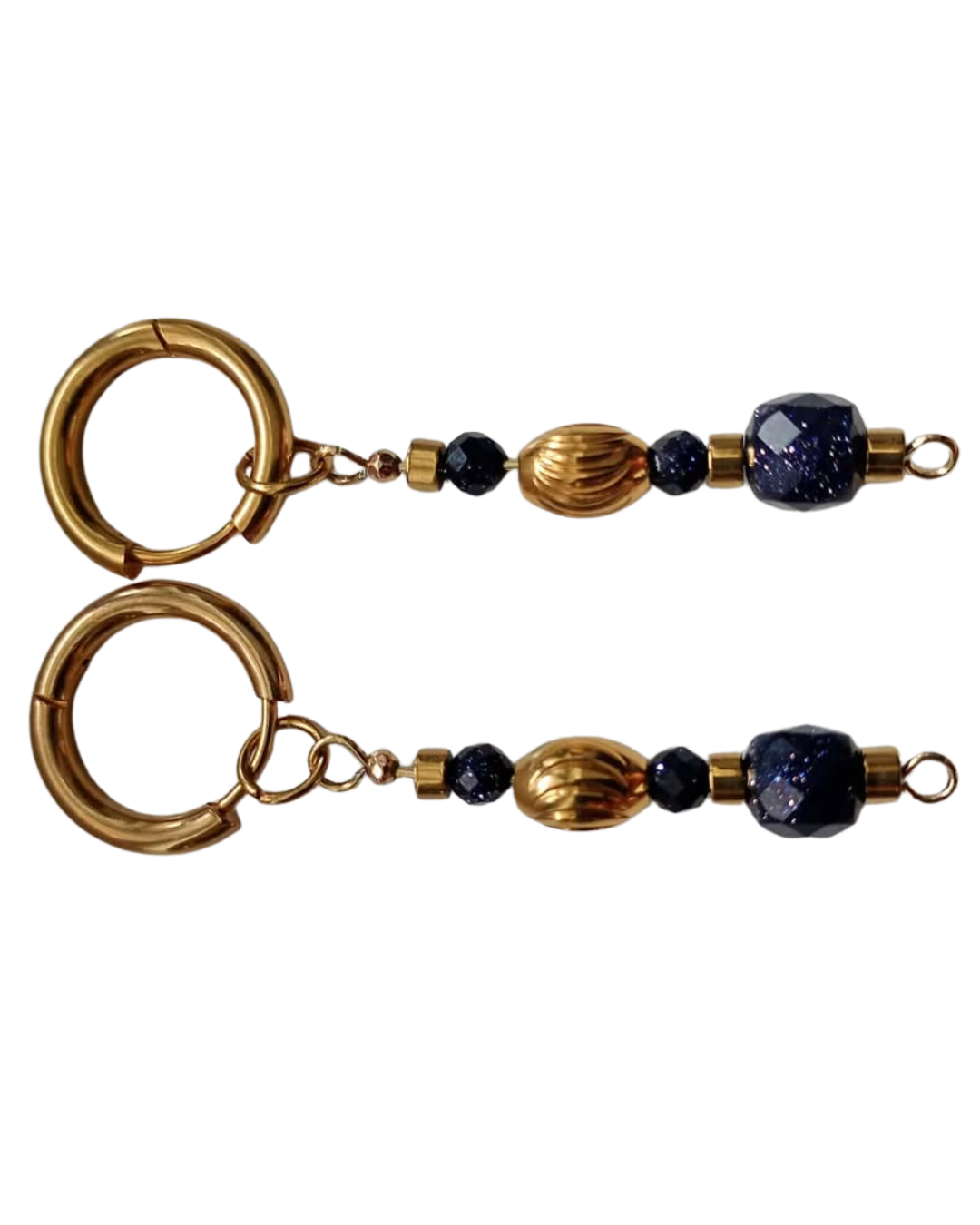 Ze stali nierdzewnej oraz kamieni. Hematyt. Rozmiar kamieni 3 mm, 4 mm, 7 mm. Długość zawieszki – 4 cm.