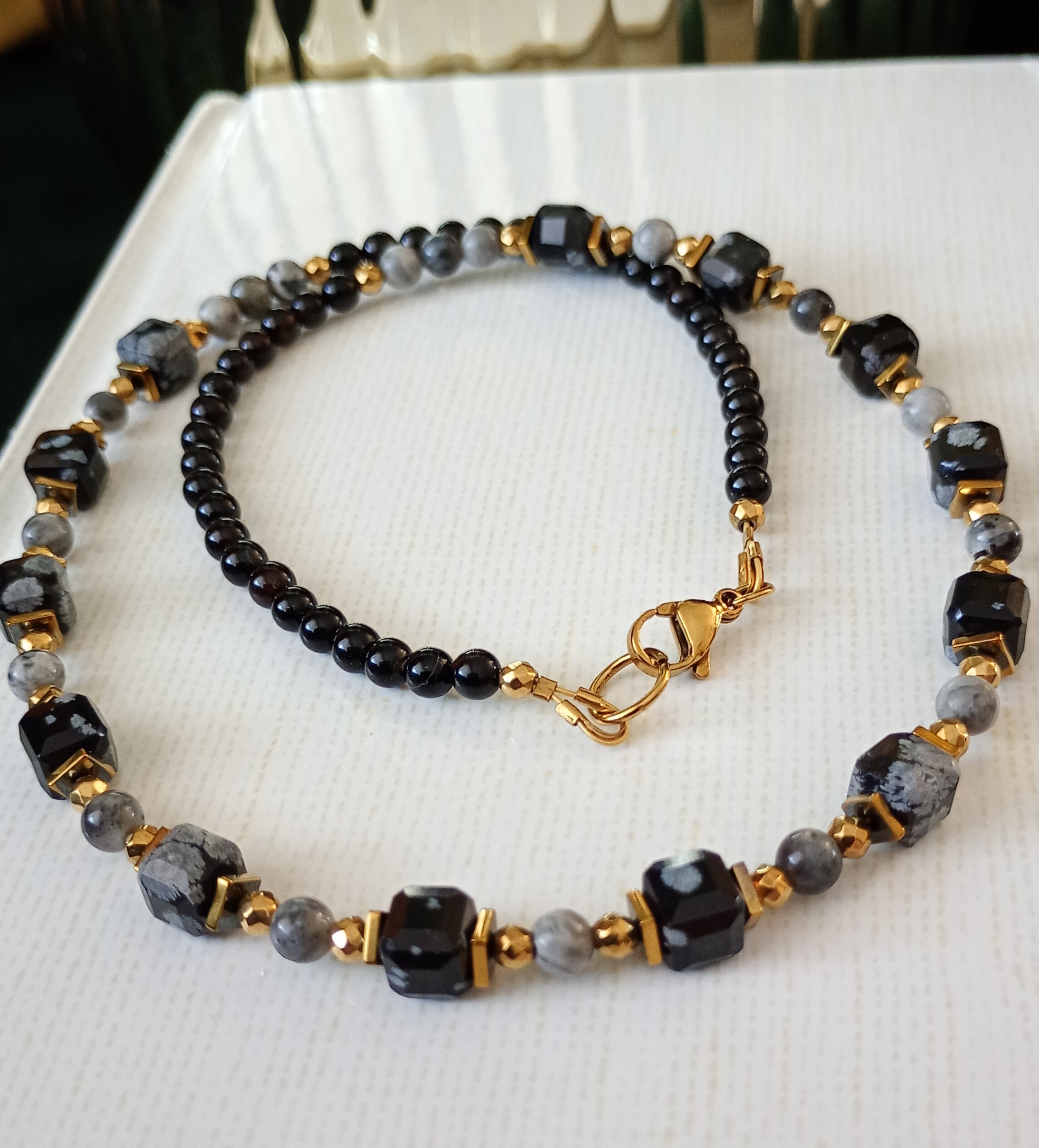 Kamienie: obsydian śnieżny o wielkości  6/6mm, czarny agat, labradoryt, jaspis mapa  o wielkości 4 mm oraz hematyt. Długość naszyjnika 48 cm. Wykonany na lince jubilerskiej  Griffin. Zapięcie  ze stali nierdzewnej.
